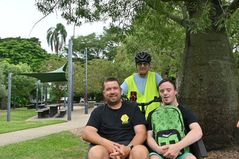 Cycling Without Age volunteer Peter and his passengers riding in New Farm Park. Photography: Jonah Rizqallah Pedal power creates active community By Jing Yeo Wan Cycling Without Age (CWA) in
